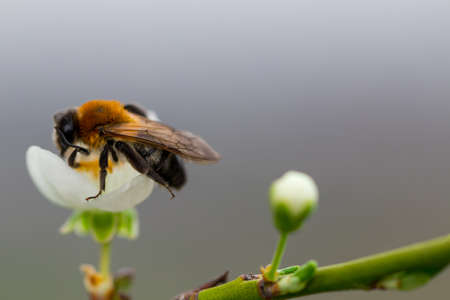 Natural closeup on a female grey-gastered mining bee, Andrena tibialis, drinking nectar from a white flowering Blackthorn, Prunus spinosa