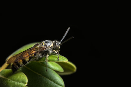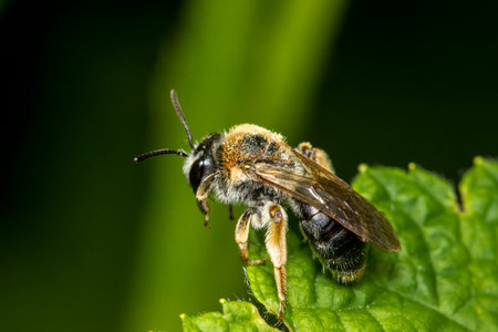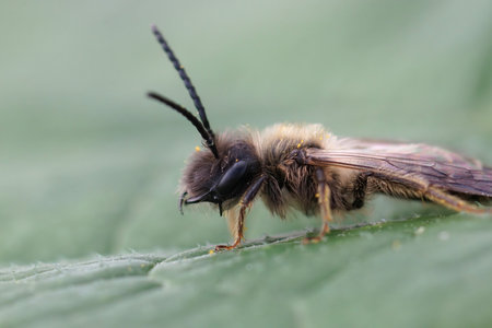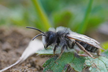 Detailed closeup on a male of the rare Trimmers mining bee, Andrena trimmerana , with it's typical jaw-tooth