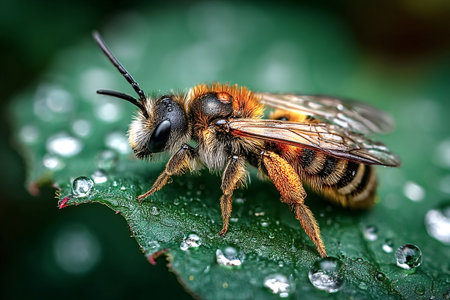 Close-up macro photograph capturing a bee resting on a vibrant green leaf covered in glistening morning dew, highlighting intricate details of the bee and leaf texture