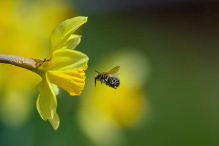 A bee collects pollen near a flower. A bee flies over a flower in a blur background.