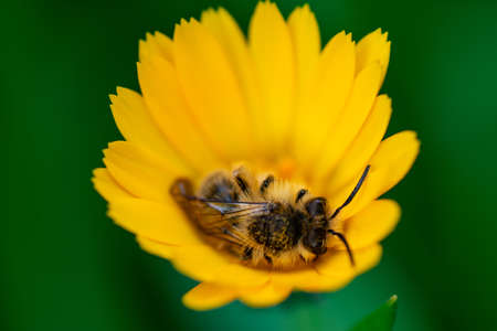 Image of bee or honeybee on yellow flower collects nectar. Golden honeybee on flower pollen with space blur background for text.