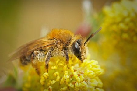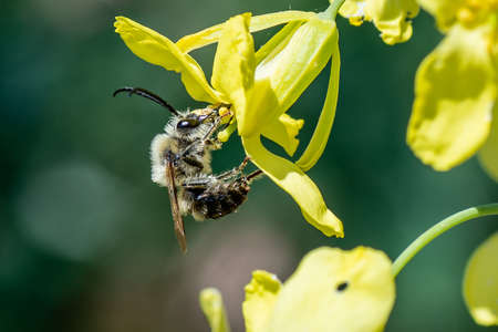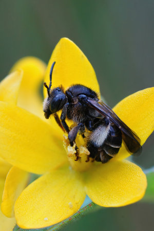 Detailed closeup on a male orange-tailed mining bee, Andrena haemorrhoa on a yellow flower