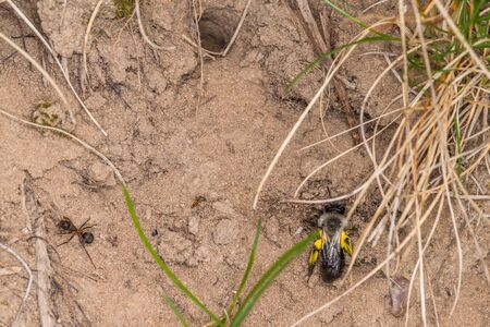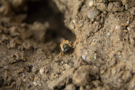 A wild bee entering its burrow in the bare earth
