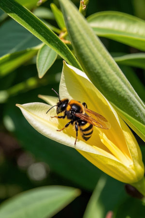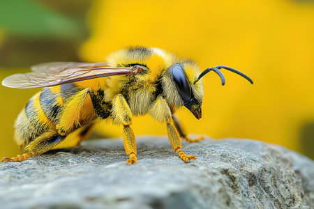 A bee gathers pollen from a vivid yellow flower on a sunny spring day, showing nature's beauty.
