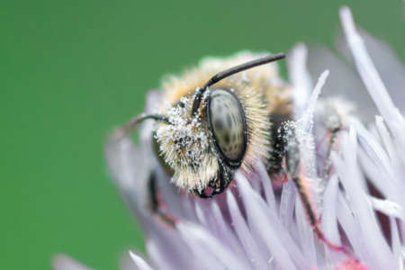 Closeup on a furre white female Grey-backed mining bee, Andrena vaga, sitting on top of a flower against a green background