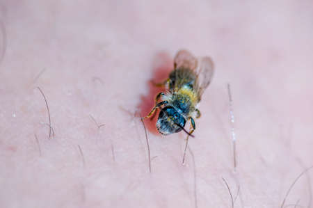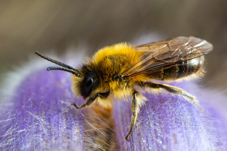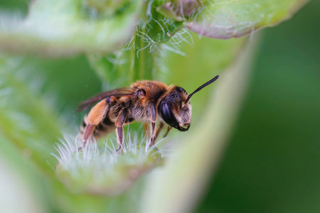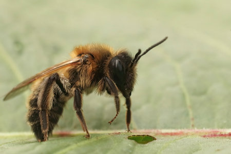 Closeup on a too soon and freshly emerged female Chocolate mining bee, Andrena scotica in the garden