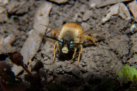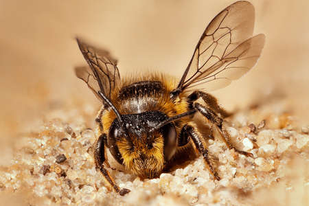 wild bee sitting in sand with wings high and head to camera with visible sharp net eyes