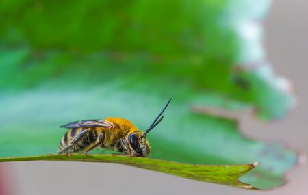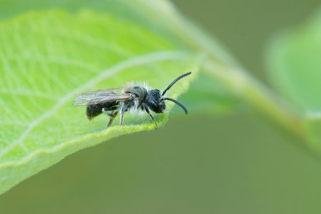 Closeup on a cute , small male white haired mining bee, Andrena , sitting on a green leaf in the garden