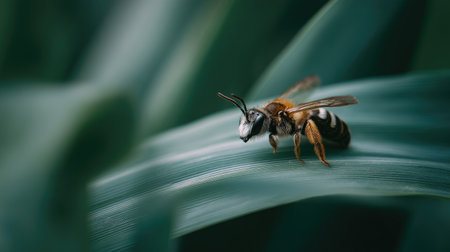 a macro shot of a bee on a green leaf