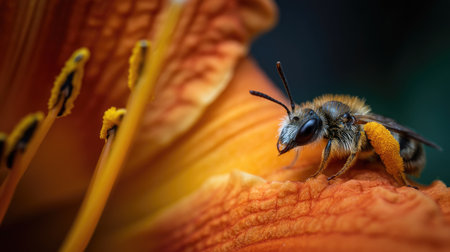 A stunning close-up of a bee gathering pollen from an orange flower petal, showcasing intricate details of its anatomy and vibrant colors. Perfect for nature themes.