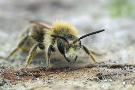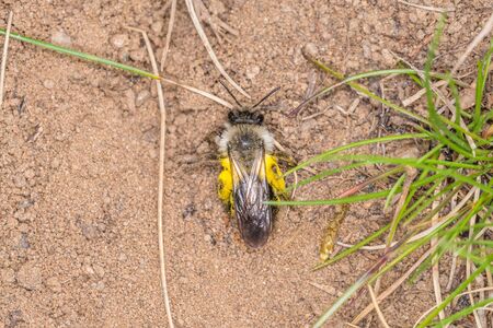 Single earth bee male with yellow pollen on the ground, Germany
