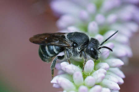 Close up of a cleptoparasite bee, Stelis punctulatissima on a lightblue flower in the garden.