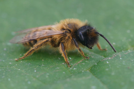 Closeup on a hairy male Yellow legged mining bee, Andrena flavipes , sitting on a green leaf