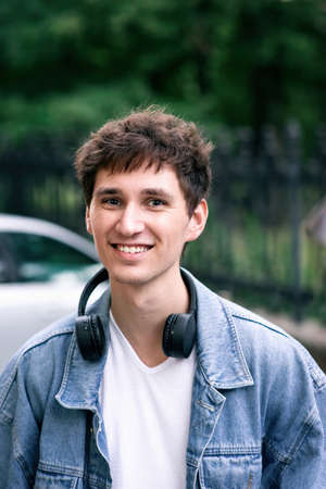 Portrait of a smiling man with brown hair, in white t-shirt and jeans jacket with headphones