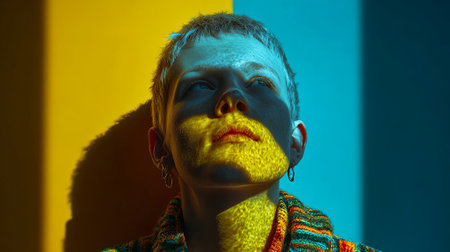 Female figure with short hair looks up, bathed in colorful shadows, creating a striking visual effect in a contemporary artistic setting, AI generated
