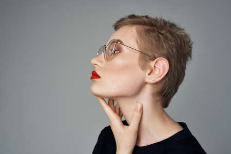 Woman with short hair and dark glasses makeup red lips glamor close-up