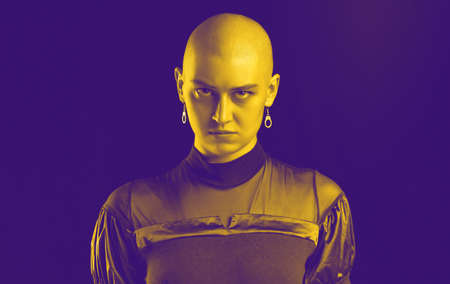 Portrait of a beautiful young woman with short hair in neon light. Displeased girl posing