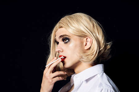 Avant-garde fashion. Portrait of a young man with women’s makeup and women’s clothing posing in blue light on a crimson background.