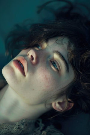 A woman with brown hair and blue eyes is laying on her back. She has a red lip and a nose piercing