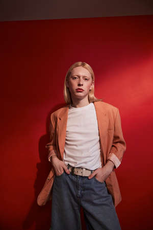 Avant-garde fashion. Portrait of a young man with women’s makeup and women’s clothing posing in blue light on a crimson background.
