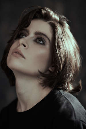 Portrait of a brunette girl with dramatic dark eye makeup looks up with an expression of tiredness and emptiness in her eyes. Psychological picture. People, emotions.