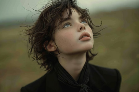 Featuring a young person in a black suit looking up, high quality, high resolution