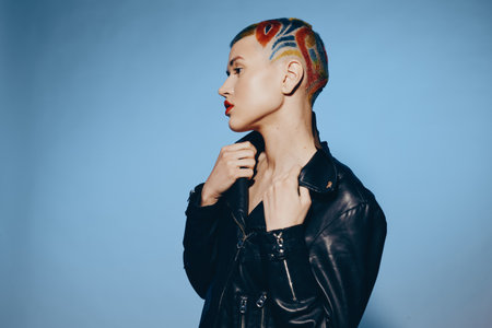 Stylish woman with colorful shaved hair and tattoo, wearing a black leather jacket, posing confidently against a soft blue background in a modern portrait.