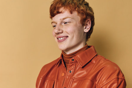 Young man with red hair wearing orange leather jacket smiles and looks down with happy expression on solid beige background in closeup portrait.