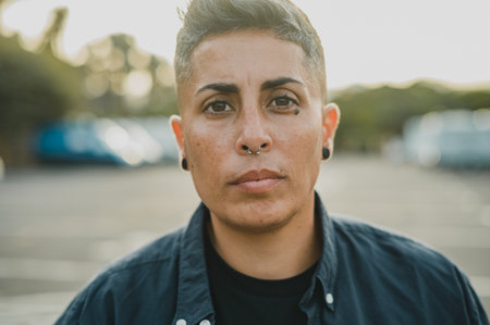 Portrait of Hispanic female with round black ear studs and in casual clothes looking at camera while standing on blurred city street during daytime