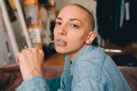 Woman with septum at his nose smoking hand rolled tobacco cigarette at home