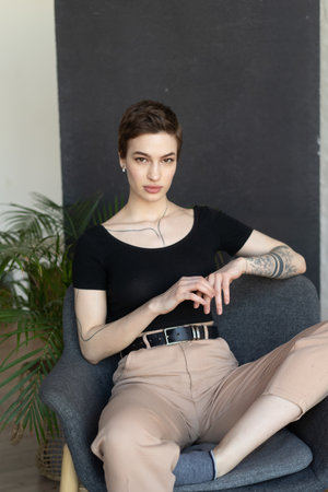 young beautiful woman sits on an armchair in a black t-shirt in the studio