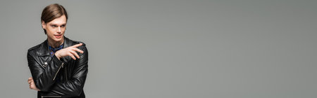 smiling pansexual person in black leather jacket looking away and pointing with finger isolated on grey, banner