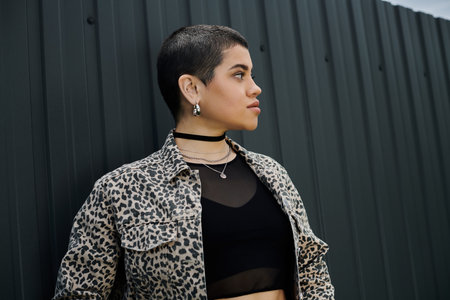 A stylish young woman with short hair wears a black top and a leopard print jacket near a modern building.