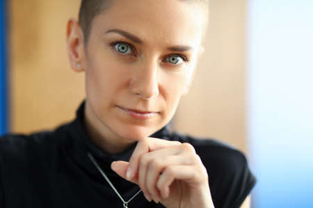 Close-up of lovely woman looking at camera with calmness and seriousness. Serious female person touching face by hand. Feminine with charming blue eyes