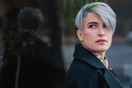 Portrait of a young beautiful woman in green coat with a short haircut and dyed hair. Grey main color and yellow, green, blue and red hair color. Posing in the street.