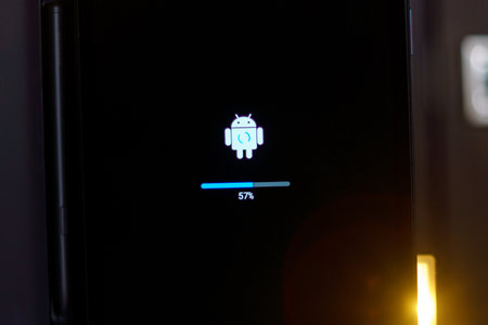JAKARTA - Indonesia. April 12, 2019: Close up of smartphone with android robot logo during software installs or updates