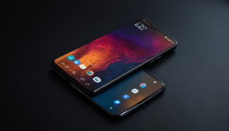 Modern smartphone featuring a blank orange screen, reflecting beautifully on a dark glass surface, creating a striking visual in low light