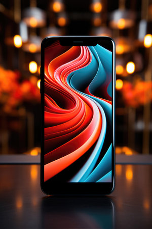 A stunning smartphone display featuring a vibrant abstract design with bright hues of blue, orange, pink, and yellow, set on a classic marble surface.