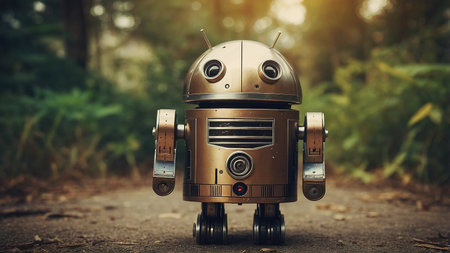 A very small retro robot walks in the forest