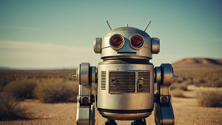 A quirky vintage robot stands in a vast desert landscape under a clear blue sky at sunset