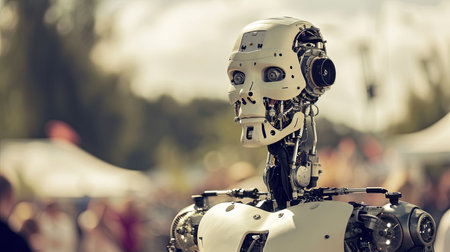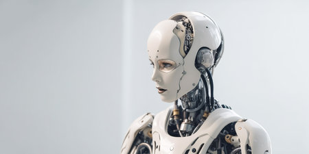 Futuristic humanoid robot with intricate mechanical components and sleek design, showcasing advancements in artificial intelligence and technology in modern environments