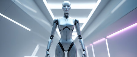 Futuristic humanoid robot with advanced technology features in a sleek, modern sci-fi corridor illuminated by ambient lighting