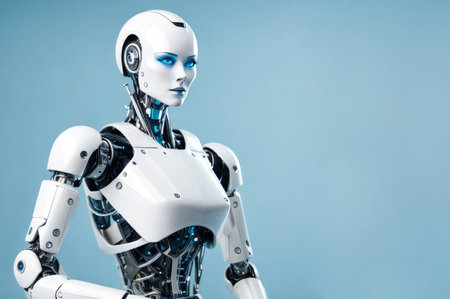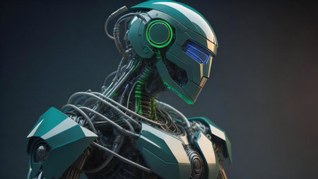 Futuristic robot with humanoid design on teal background