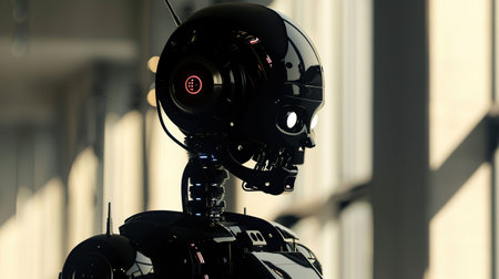 A futuristic illustration of a robot with artificial intelligence. The robot is sleek and advanced, with glowing eyes and a powerful presence