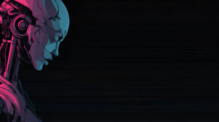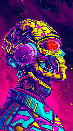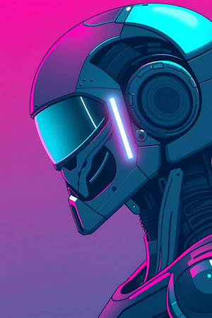 A sleek, futuristic robot head in a vibrant neon style. Perfect for tech, gaming, and science projects, this design embodies innovation and the future. Ideal for digital media, this dynamic artwork is a great fit.