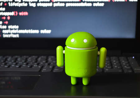 A green android figure stands on a laptop on a programming code screen. View through a magnifying glass. July 2020. Kiev, Ukraine