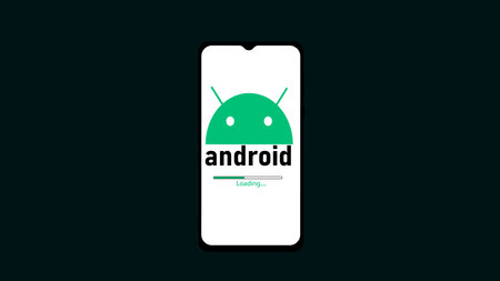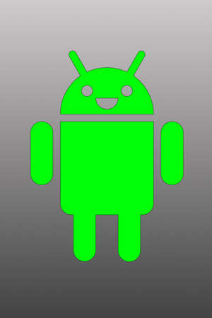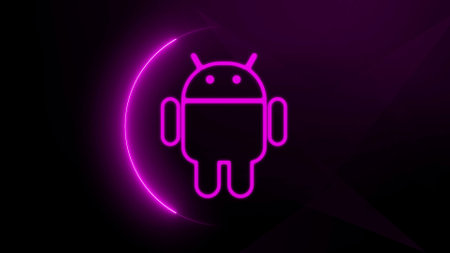 Glowing Android system device logo on smart phone design illustration background.