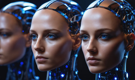 Three robotic women with blue eyes stare into the distance