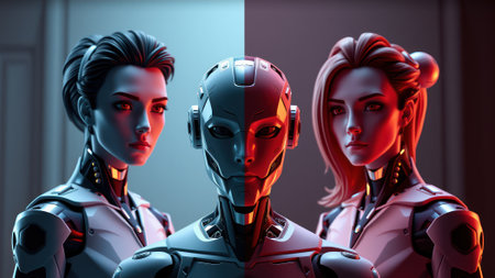 Two female androids stand beside a central robotic figure, illuminated by contrasting blue and red lighting. Their expressions are stern, adding to the futuristic and artificial ambiance. AI generation