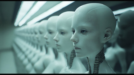 AI Generative Army of humanoid cyborg robots stands in line